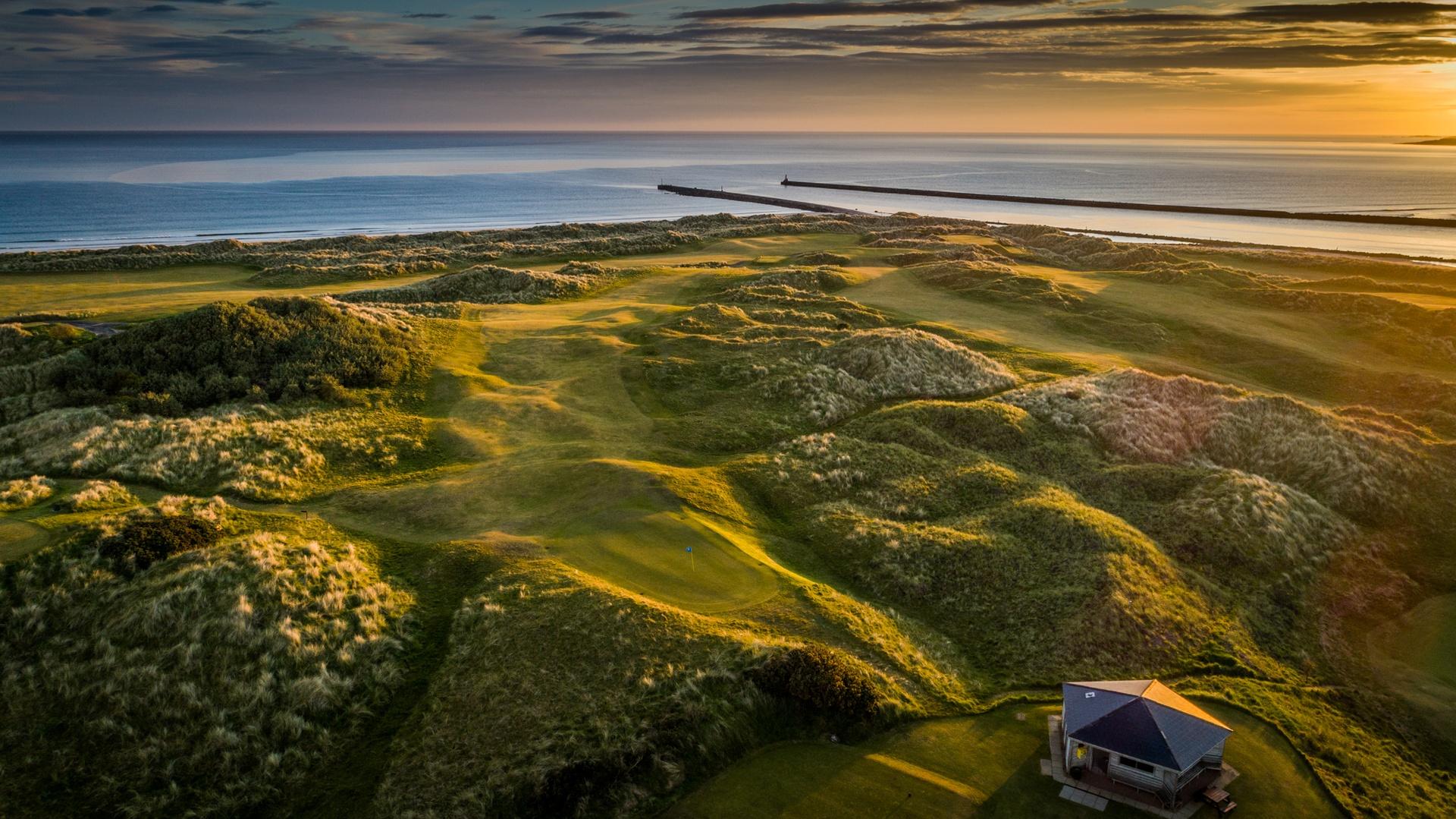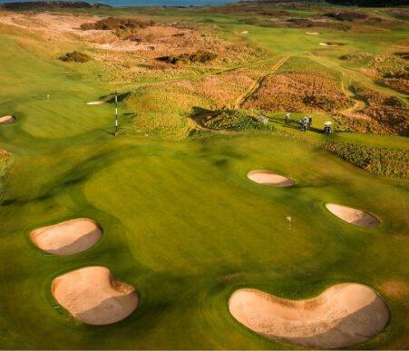 The course unfolds across towering dunes thick with heather and gorse, with fairways rising and falling through striking natural ground. Blind tee shots are a defining feature, demanding trust and commitment and adding to the sense of adventure. The opening stretch is exceptional, building to the famous ninth hole, where the fairway tumbles toward the clubhouse with the mountains framed beyond.